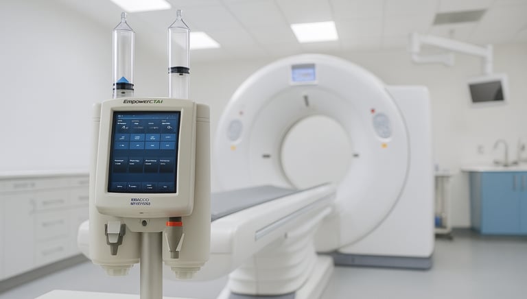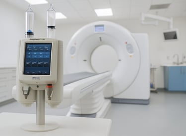 Inyector automatizado que administra medios de contraste en estudios de tomografía computarizada (TC).